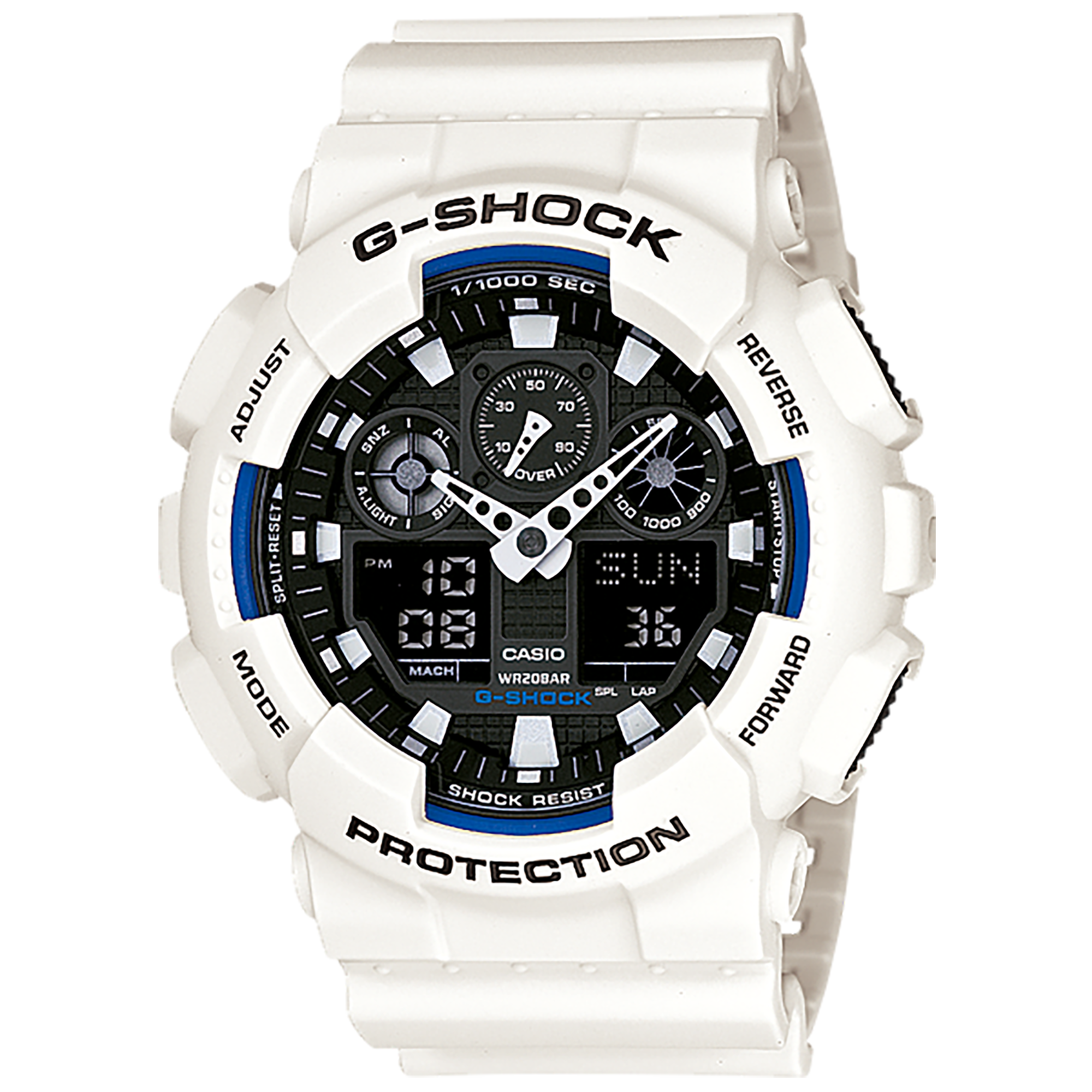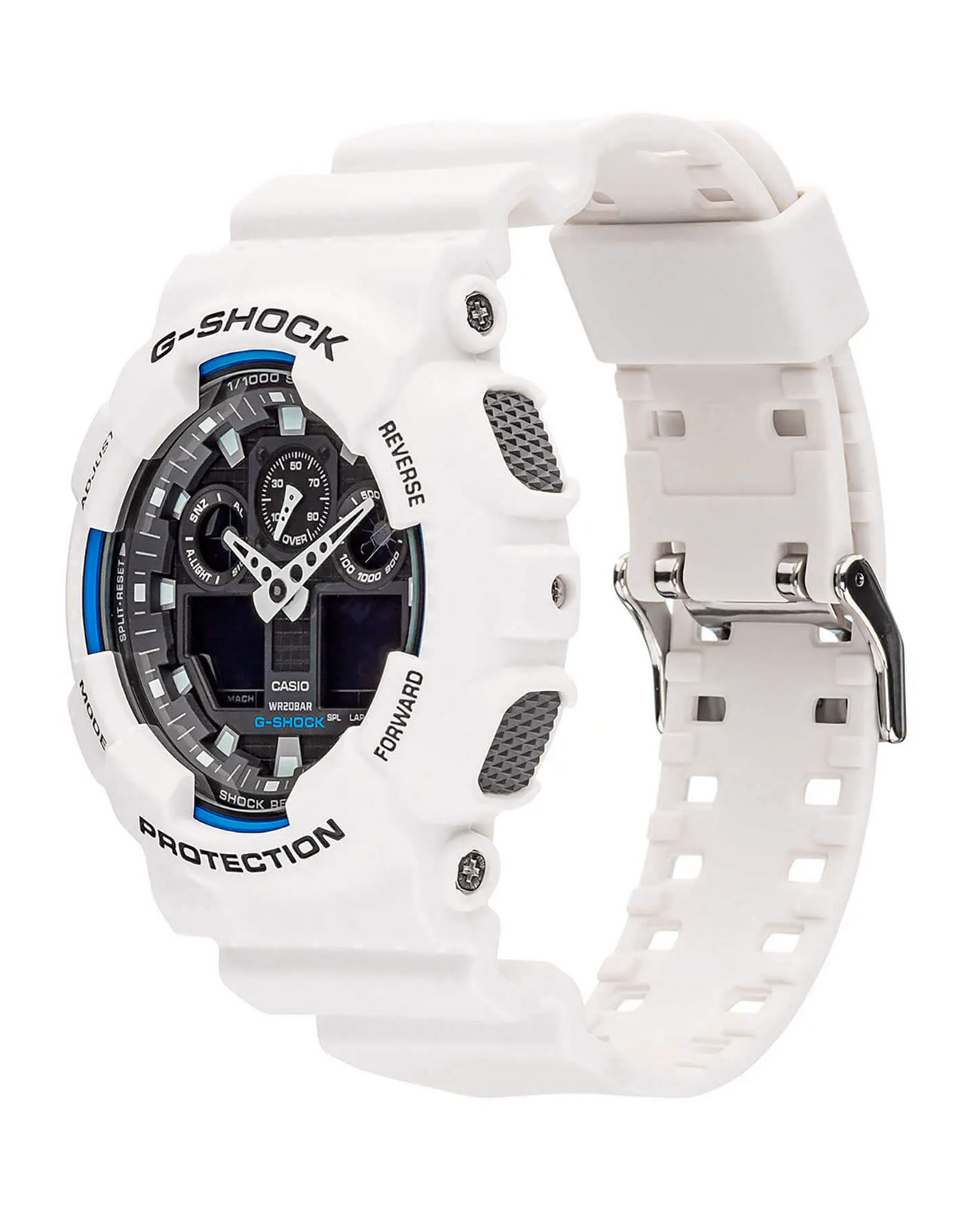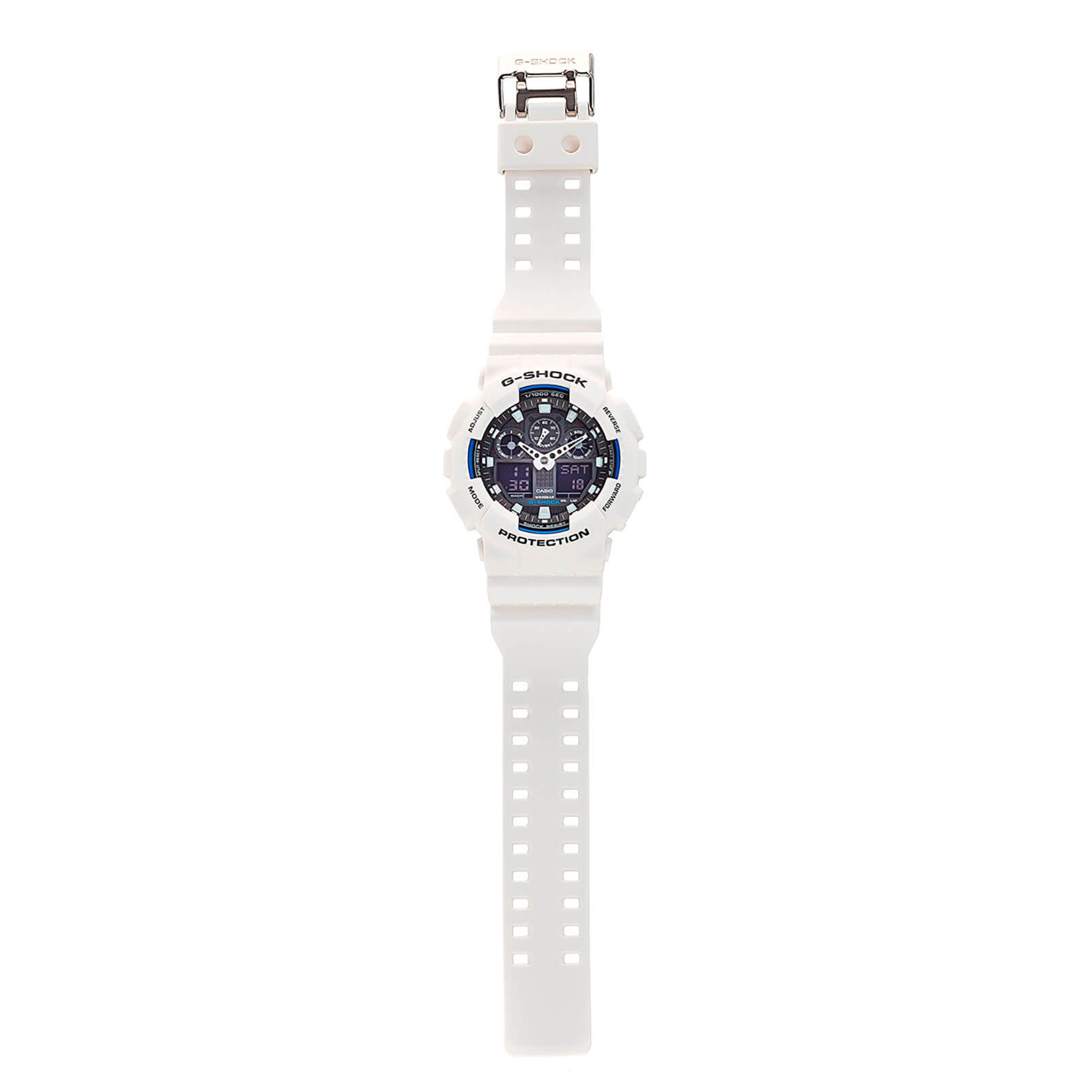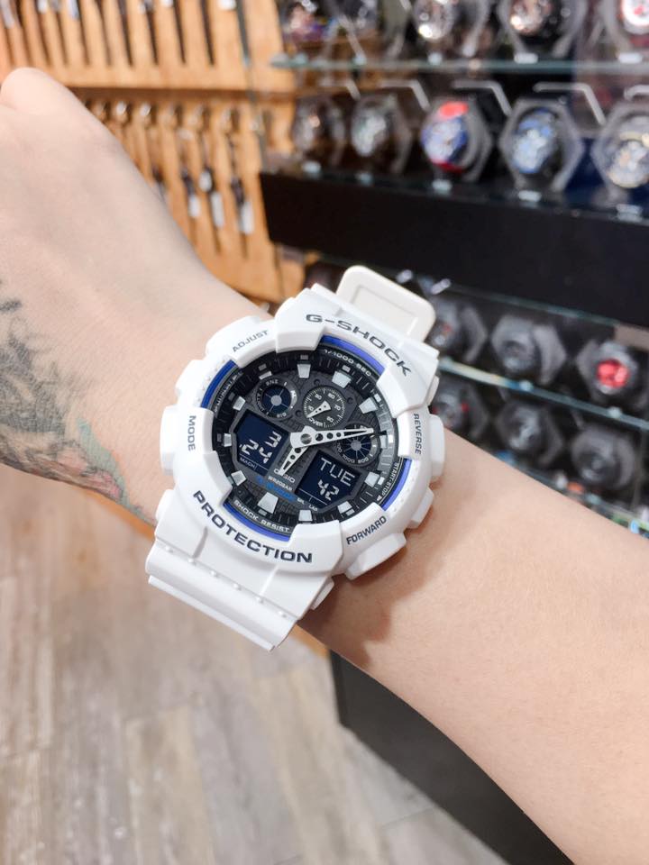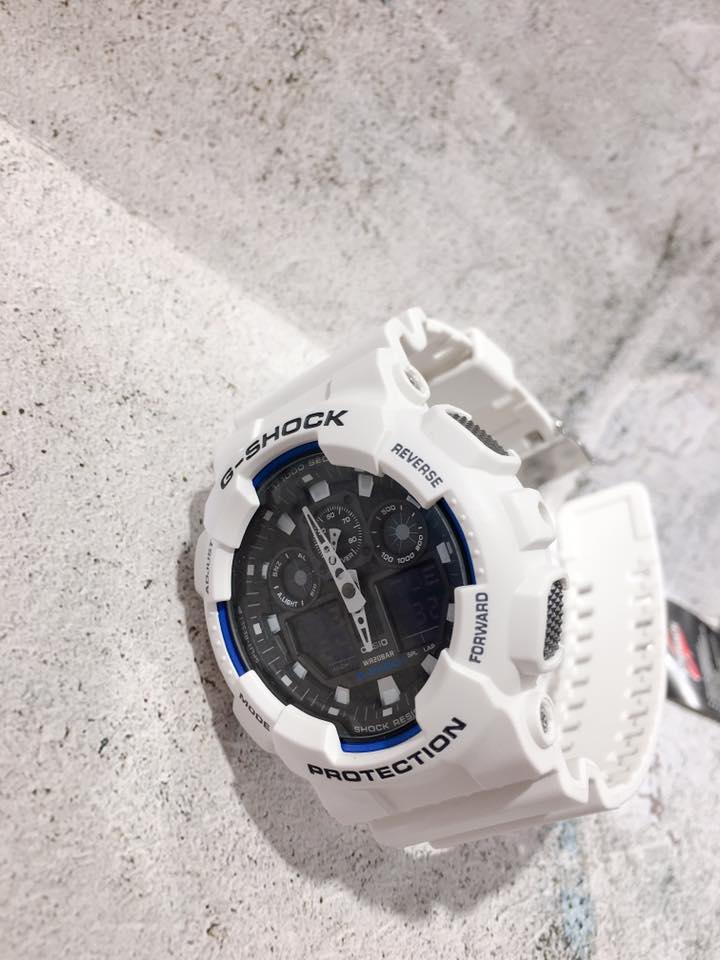G-SHOCK ซีรีส์ GA-100 รุ่นระบบผสมอะนาล็อกและดิจิตอล โดดเด่นด้วยหน้าปัดทรงกว้าง ใช้สีขาวและดำแบบด้านแสนเรียบง่ายที่ตัวเรือนและสาย จัดวาง 4 หน้าต่าง LCD และมาตรอัตราเร็วให้สมมาตรกันบนหน้าปัด เป็นดีไซน์หน้าปัดแสนเรียบง่าย มีการใช้งานที่โดดเด่น โดยมาพร้อมตัวจับเวลามิลลิวินาที มาตรอัตราเร็ว และความทนทานแรงแม่เหล็กระดับ JIS Class-1 รุ่นทนทานที่สะดุดตาในแบบสไตล์สตรีท