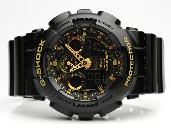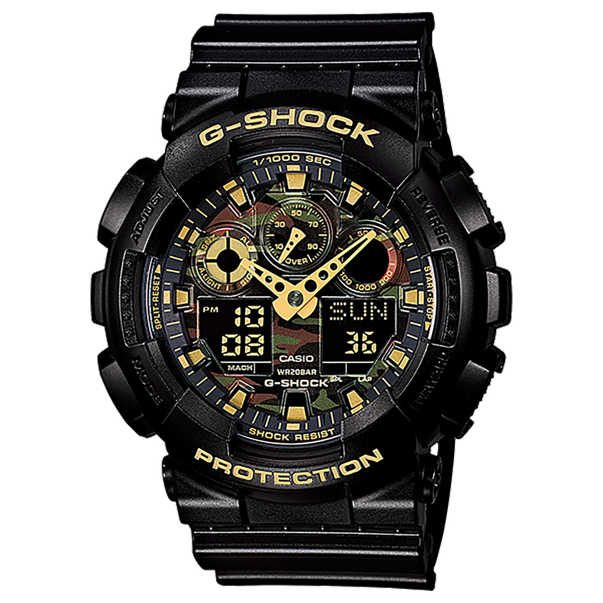 G-SHOCK ซีรีส์ GA-100 นาฬิกาสุดทนทานที่มีการพัฒนายกระดับความแข็งแกร่งทนทานอยู่ตลอด รุ่นจากซีรีส์หน้าปัดลายพรางมีหน้าปัดตกแต่งลายพราง ซึ่งกำลังเป็นที่นิยมมากขึ้นในดีไซน์ของแบรนด์แฟชั่น ใช้รุ่น GA-100 อันเป็นที่นิยมจากตัวเรือนขนาดใหญ่ดูโดดเด่นเป็นรุ่นต้นแบบ ตัวเรือนและสายมีพื้นสีดำเข้ากับหน้าปัดลายพรางแบบเมทัลลิคที่เตะตาเพื่อให้ภาพลักษณ์สุดเท่ในสีที่ทันสมัย ซีรีส์ลายพรางที่แสดงถึงความทนทานของ G-SHOCK ด้วยดีไซน์แบบทหาร